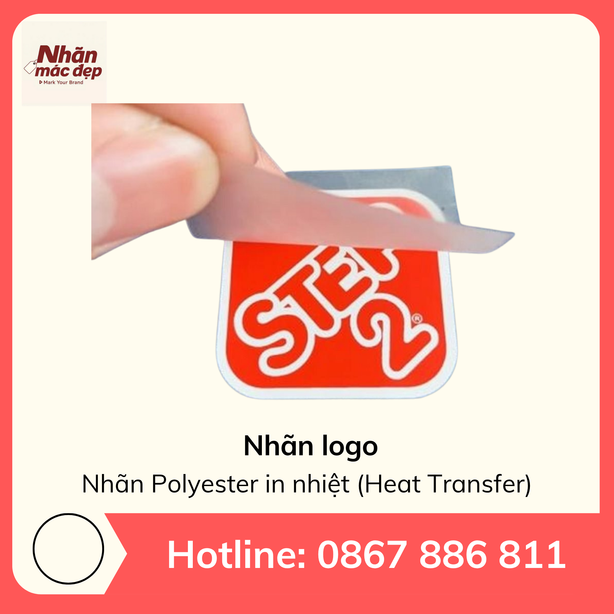 Nhãn logo in nhiệt (Heat Transfer) từ chất liệu polyester là giải pháp tối ưu để gắn thương hiệu trực tiếp lên sản phẩm mà không cần may. Với khả năng bám dính chắc, hình ảnh sắc nét và màu sắc sống động, nhãn giúp tăng tính thẩm mỹ, đồng thời chịu được nhiều lần giặt mà không bong tróc hay phai màu.