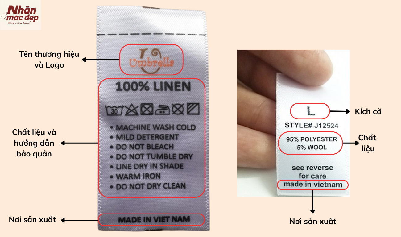 Nhãn chất liệu (Thành phần vải): Cung cấp thông tin chi tiết về thành phần sợi vải (ví dụ: cotton, linen, polyester...). Điều này không chỉ giúp khách hàng lựa chọn sản phẩm phù hợp với nhu cầu mà còn thể hiện sự minh bạch, chuyên nghiệp của thương hiệu.