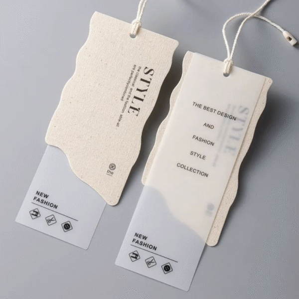 - Thẻ treo: Đây là chiếc thẻ bằng giấy (hoặc nhựa, gỗ…) được treo bên ngoài sản phẩm. Nó là thứ đầu tiên “đập vào mắt” khách hàng, mang thông tin thương hiệu, logo, slogan, và đôi khi là giá tiền. Nó như một “tấm danh thiếp” của sản phẩm.